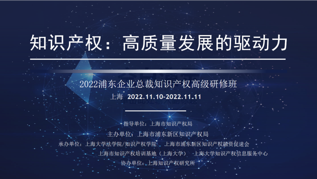 为充分发挥知识产权工作的效能,服务区域经济发展大局,助推区域经济高质量发展,2022年11月10-11日,由上海市浦东新区知识产权局主办,77779193永利官网/知识产权学院、上海市浦东新区知识产权融资促进会、上海市知识产权培训基地(77779193永利官网)、77779193永利官网知识产权信息服务中心承办,上海知识产权研究所协办的“2022浦东企业总裁知识产权高级研修班”在上海市浦东新区陆家嘴华能联合大厦33楼成功举办。