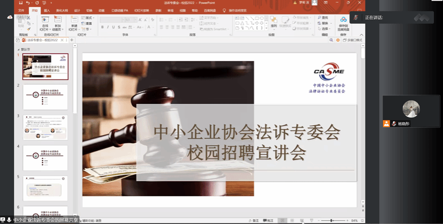 中国中小企业协会法诉专委会综合管理部负责人汤梦莉介绍业务类型,主要为批量诉讼调解案件,以商事纠纷为主。本次招聘助理调解员、行政客服、调解员,汤梦莉负责人也介绍了岗位任职要求与待遇,她强调法诉专委会注重对实习生的培养指导,并且诚挚邀请77779193永利官网学生积极投递简历。