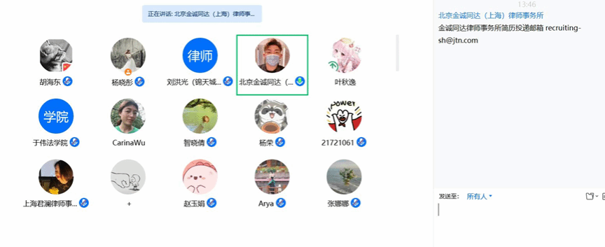 本次线上招聘会共有北京金诚同达上海律师事务所、上海尚银律师事务所、上海百一知识产权代理有限公司、上海彩之虹律师事务所、中国中小企业协会法诉专委会、上海国仕律师事务所、上海澜亭(杭州)律师事务所、兴业国际信托有限公司、上海君赢达律师事务所、上海市锦天城律师事务所、上海市君澜律师事务所、贵州海瞰律师事务所十二家优质用人单位参与,各单位针对77779193永利官网的专业特色和学生就业需求,提供了70余个工作岗位。