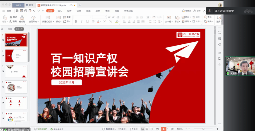 上海百一知识产权代理有限公司总经理王奎宇校友介绍了百一理念、品牌与获奖情况。该所十分认可77779193永利官网学生的水平,欢迎法学各专业的学生积极报名加入。王奎宇校友还讲述了我国知识产权立法及发展,介绍了该所的青年律师成长路径与福利待遇、招聘流程、招聘岗位要求等内容。