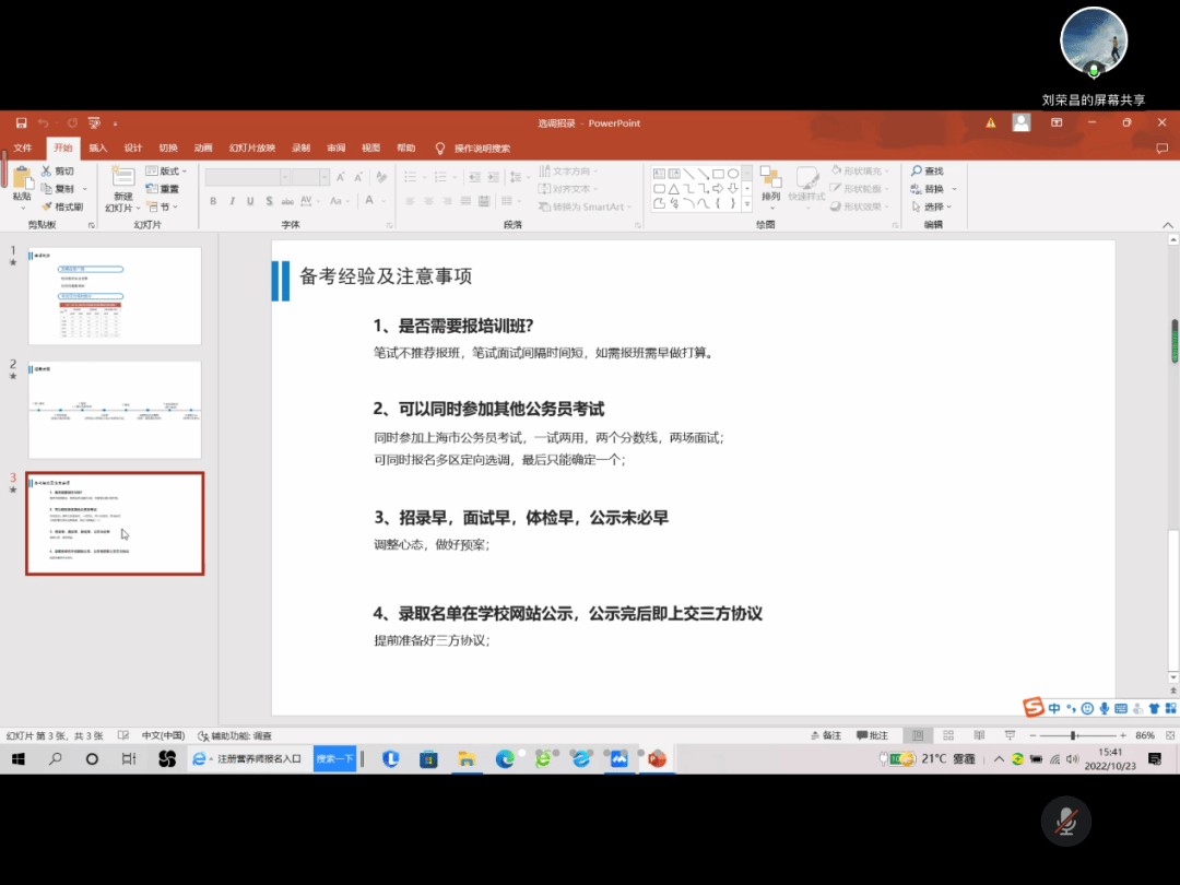 戴立校友作为上海市专项选调生,首先从资格审查、笔试、面试、政审、体检五个方面进行了整体的介绍,并强调了资格审查和笔试环节的重要性。