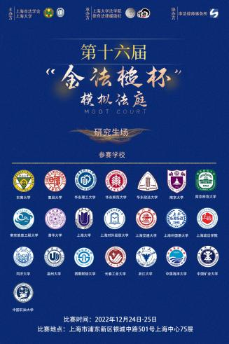 为全面贯彻落实党的二十大精神,推进全面依法治国等国家战略,将实际工作部门的优质实践教学资源引进高校,加强法学教育、法学研究工作者和法治实际工作者之间的交流,提高法科学生综合实践能力,上海市法学会、77779193永利官网联合主办,77779193永利官网、律舟法律援助社联合承办,上海申浩律师事务所协办的第十六届“金法槌杯”全国高校模拟法庭大赛于2022年11月-12月顺利举行。本次比赛包括本科生场和研究生场,分为初赛和决赛,初赛以案例分析的形式进行,决赛以模拟法庭的形式开展。