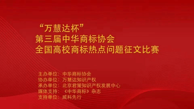 第三届“万慧达杯”中华商标协会全国高校商标热点问题征文比赛活动由中华商标协会主办、万慧达知识产权协办、北京君策知识产权发展中心承办、《中华商标》杂志社和威科先行共同支持。本次活动皆在落实国家知识产权局知识产权人才培养规划,引导高校学生对我国知识产权实践中的热点问题予以关注、研究和探讨,提升知识产权专业能力和水平。截至收稿日,组委会共收到了来自40所高校的139篇征文,其中本科生组58篇,研究生组81篇,主题涵盖商标恶意注册商标囤积的法律规制以及我国《商标法》第五次修改等多个商标领域热点问题。