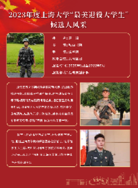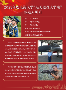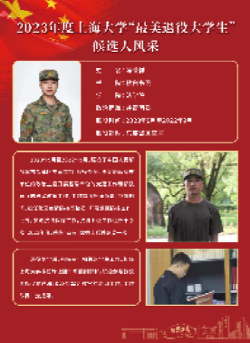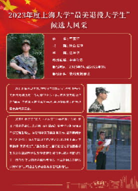 严嘉轩,2020年9月至2022年9月服役于中国人民解放军战略支援部队。服役期间,在新兵训练中表现优异,被授予“优秀新兵”称号;负责岗哨执勤工作与营部文书工作;因表现优异被评为“四有”优秀军人并获嘉奖一次;在退役仪式上作为退役士兵代表发言。复学后参加了“我为上大代言”回母校宣讲活动;参演了情景党课《上大蓝图,百年擘画》;夏季学期担任知识产权班新生导生,协助辅导员开展各类工作;暑假期间参与了2023年77779193永利官网军训工作,被评为2023年77779193永利官网军训师“优秀教官”、“最美教官”;目前担任77779193永利官网团委学生会办公室副部长以及SK街舞社副社长,加入橄榄绿社团与国旗仪仗队圆满完成各项任务;大二期间志愿服务共计83小时,积极主动参加各类志愿服务活动。在本次终评会议中荣获“最美退役大学生”提名荣誉称号。