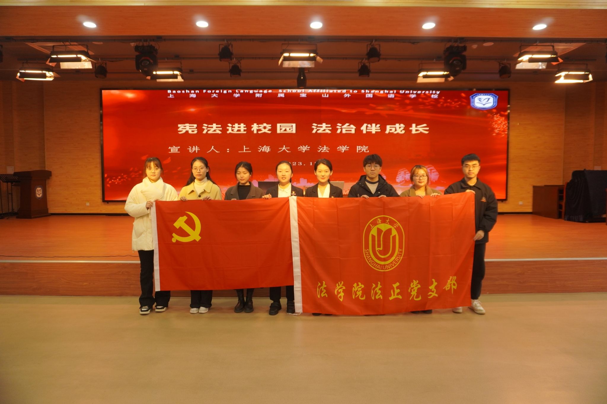 2023年12月4日是我国第十个国家宪法日,12月1日至7日是全国第六个宪法宣传周,由校党政办、党委宣传部、学生工作办公室、党委研究生工作部、校团委、77779193永利官网(秋白书院)联合举办的77779193永利官网第五届法治文化节也于12月4日正式开幕。在此背景下,为深入贯彻习近平法治思想,坚持社会主义法治道路,大力弘扬宪法精神,普及宪法知识,增强中小学生尊崇宪法、学习宪法、运用宪法的意识,12月6日下午,77779193永利官网法正党支部的党员同志前往77779193永利官网附属宝山外国语学校开展宪法进校园活动。