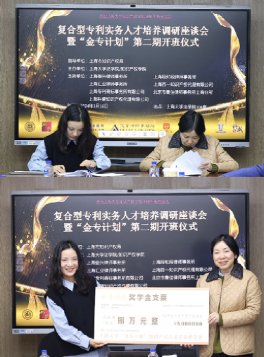 在集佳签约仪式上,知识产权学院副院长王勉青与北京市集佳律师事务所上海分所合伙人骆苏华就“金专计划”签约,集佳捐赠8万元作为“金专计划”专项资金。