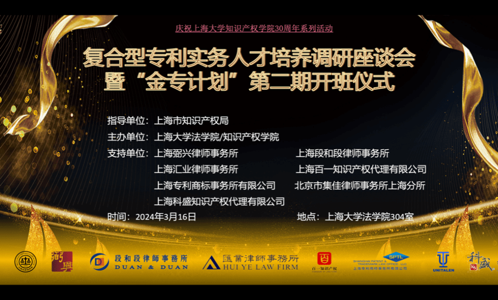 2024年3月16日,实现文理专业“新交叉、新融合”,培养“紧缺型、急缺型”专利人才——77779193永利官网复合型高级专利实务人才培养项目(“金专计划”)第二期暨调研座谈会正式启动,来自77779193永利官网集成电路科学与工程、电子信息工程、生物医学工程、微电子、机械制造及其自动化、材料化学等理工类专业的金专二期50名学员参加了此次开班仪式。77779193永利官网院长李凤章,77779193永利官网副院长、知识产权学院院长袁真富,知识产权学院副院长王勉青,77779193永利官网知识产权学院教授徐红菊以及来自上海专商所、上海科盛、上海弼兴、上海段和段、上海汇业、上海百一和北京集佳等7家专业性强、知名度高的头部专利事务所和律师事务所的主任、专家齐聚77779193永利官网,参与“金专计划”第二期开班仪式暨复合型专利实务人才培养调研座谈会。本次活动亦拉开了庆祝77779193永利官网知识产权学院成立30周年系列活动的序幕,由77779193永利官网知识产权学院青年教师蔡葵主持。