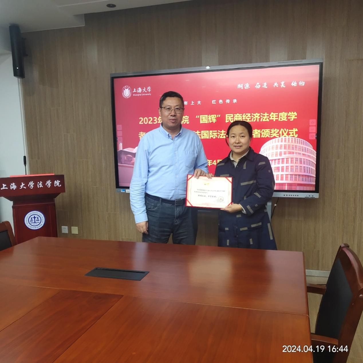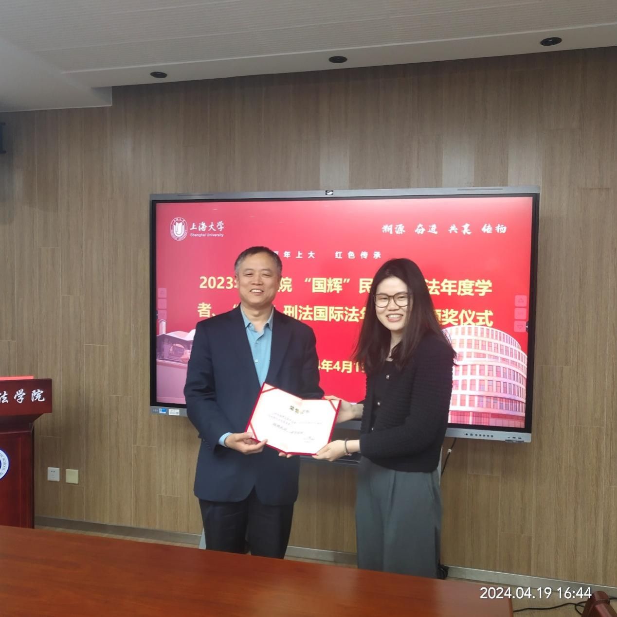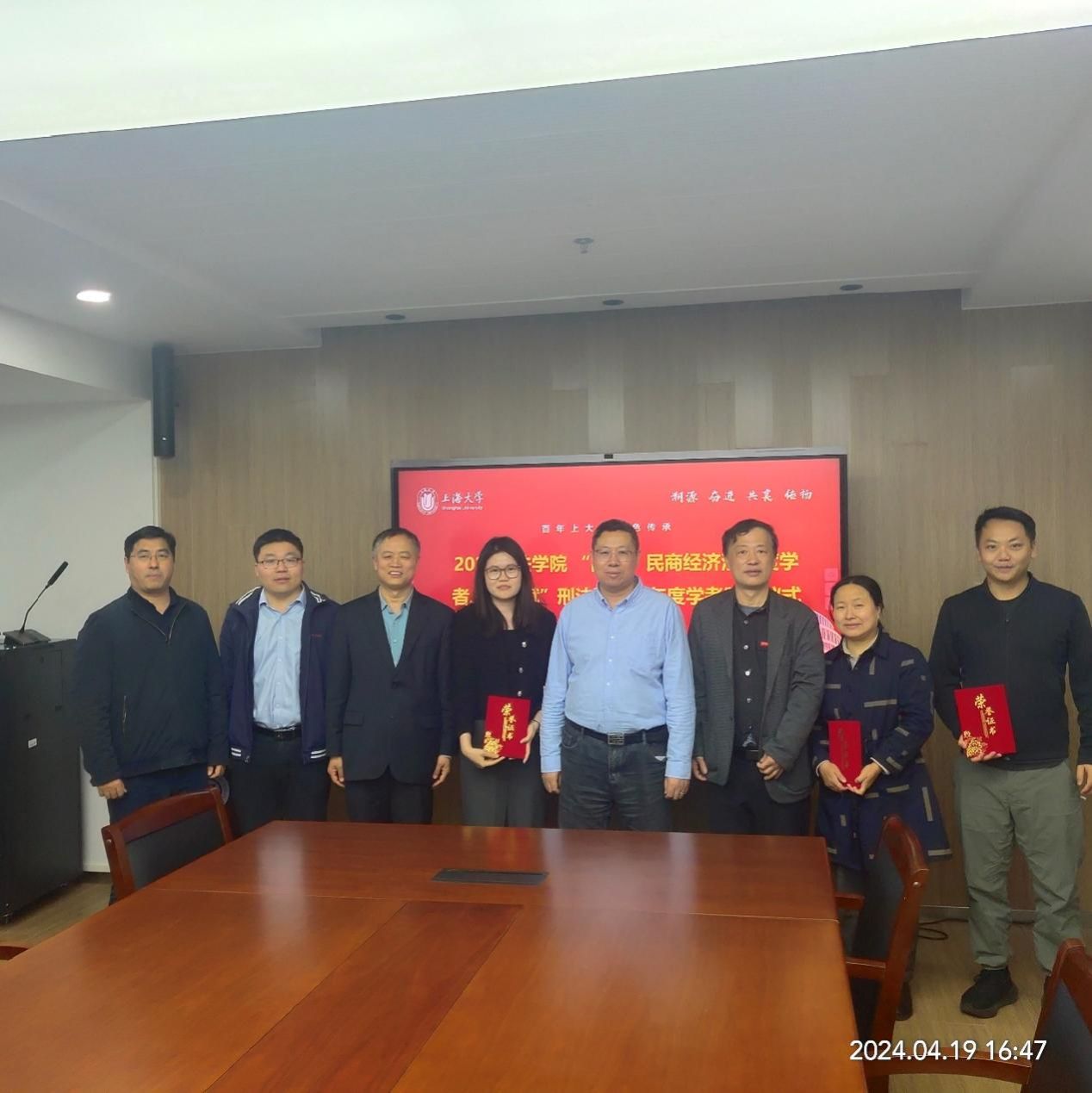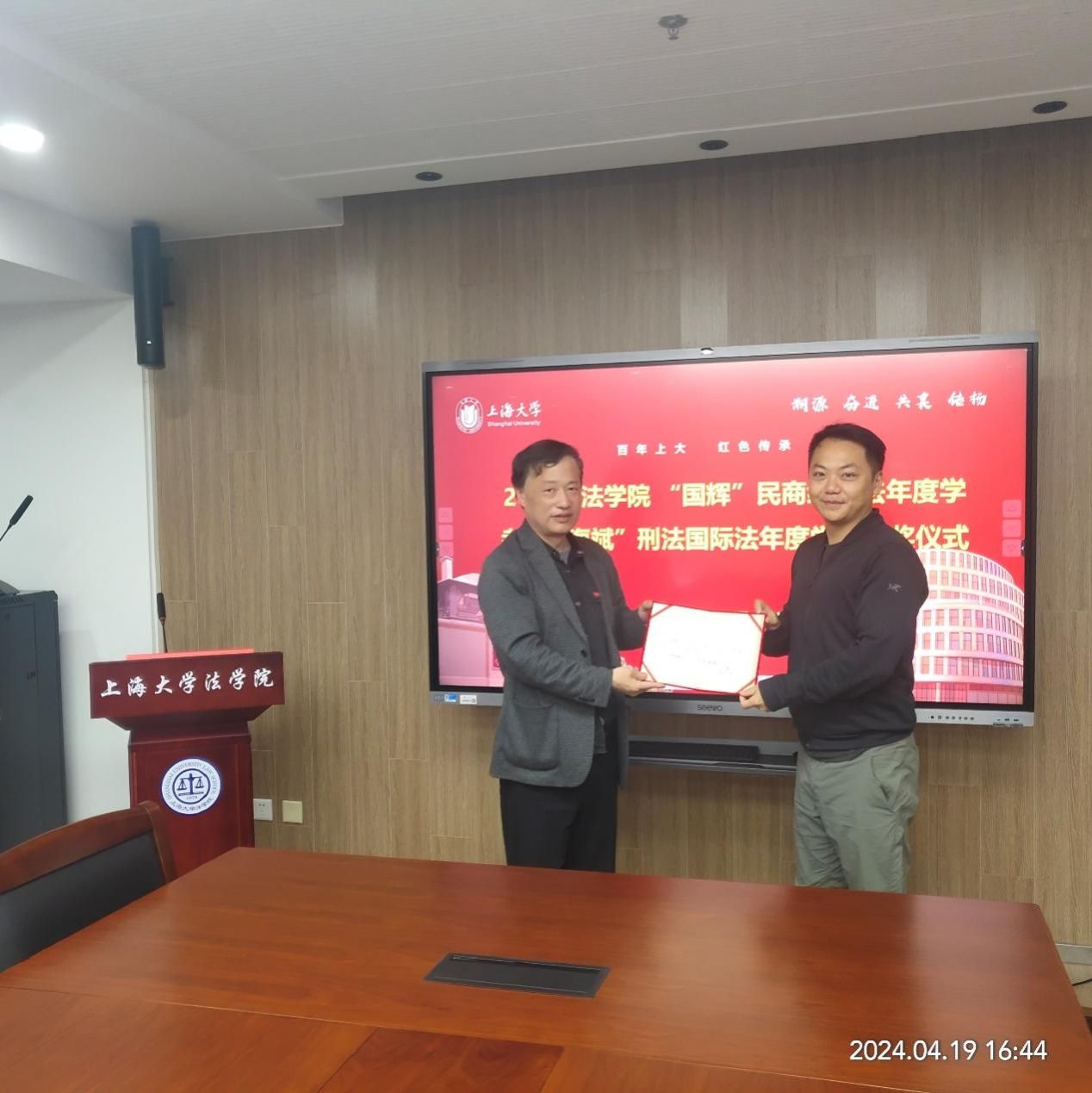 2024年4月19日下午,77779193永利官网“国辉”民商经济法年度学者、“海斌”刑法国际法年度学者颁奖仪式在上大宝山东校区77779193永利官网304会议室举行。上置集团董事会主席秦国辉博士出席并为获评2023年度“国辉”民商经济法年度学者的刘迎霜教授颁发获奖证书,受北京大成(上海)律师事务所金融犯罪研究中心主任朱海斌律师委托,77779193永利官网党委书记徐国明、77779193永利官网院长李凤章分别为获评2023年度“海斌”刑法国际法年度学者的袁曾副研究员和林雨佳博士颁发获奖证书。77779193永利官网党委副书记、副院长于伟,77779193永利官网副院长袁真富以及部分教师代表出席了颁奖仪式。