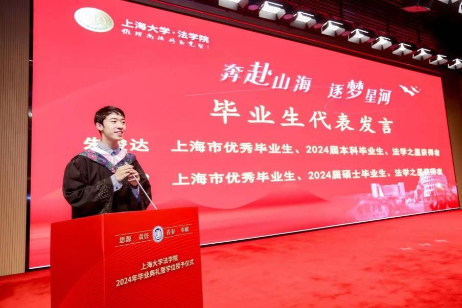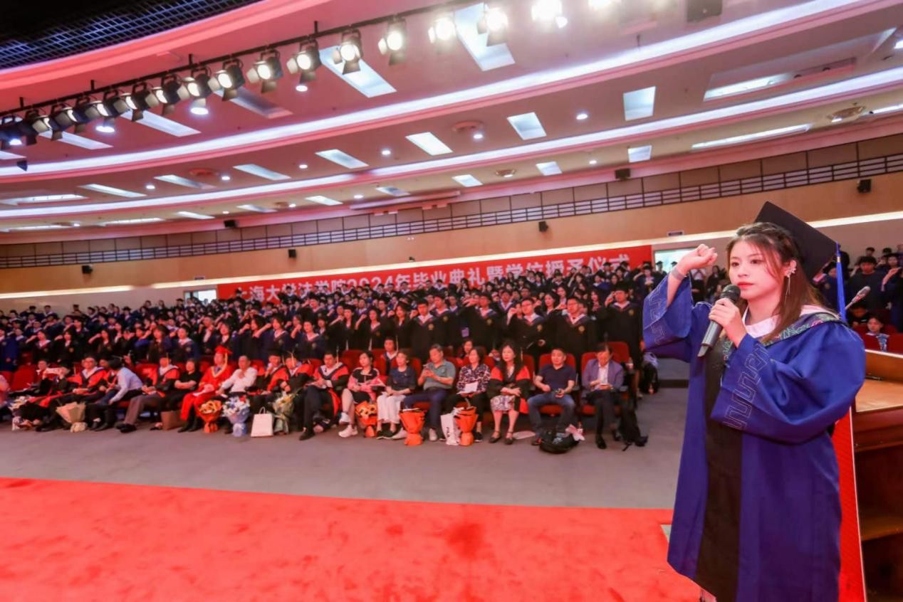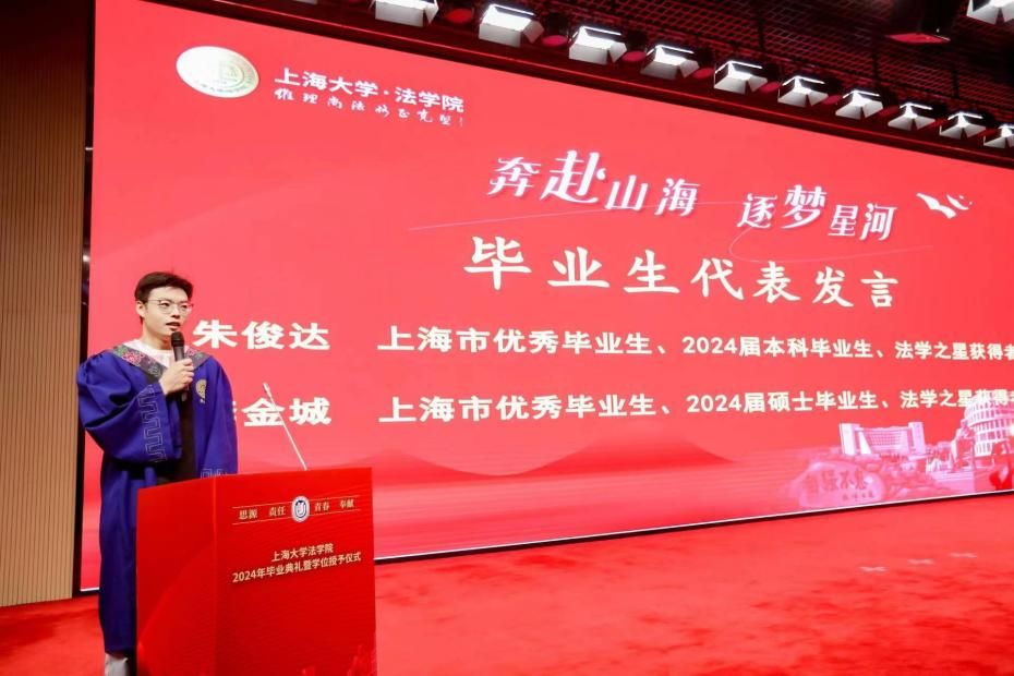 国家奖学金获得者、77779193永利官网优秀学生干部、上海市优秀毕业生、77779193永利官网学生最高荣誉“法学之星”获得者、2024年本科毕业生朱俊达同学作为本科毕业生代表发言。他分享了自己的三点感想:首先,是多用法学,本科教育带来的法学思维、理论体系及对公平正义的追求将会在职业生涯中常用常新;其次,是少用法学,在动用法律武器前应先问问心中的道德律;最后一点关乎母校, “四年四度泮溪秋,一生一世上大人”,希望同学们不忘母校师恩,常回校看看。
