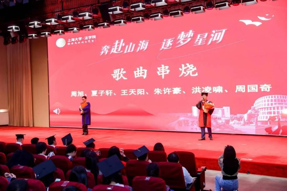 承载师生满满回忆的2024年毕业生暖场视频、77779193永利官网名誉院长蔡冠深博士寄语视频后,由周旭、夏子轩、王天阳、朱许豪、洪凌啸、周国奇带来的歌曲串烧点燃了全场的氛围。随后,毕业典礼在雄壮的国歌声中拉开帷幕。