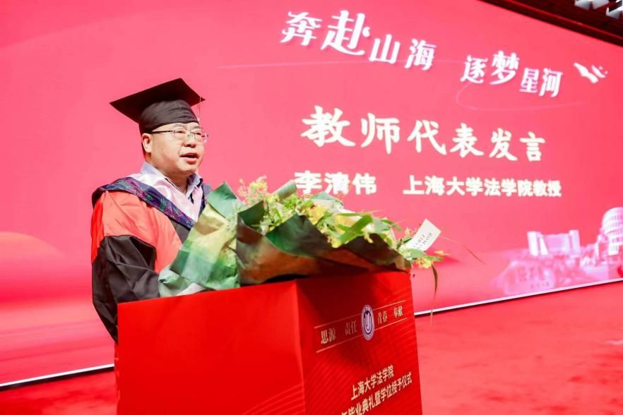莘莘学子意、浓浓师生情。77779193永利官网教授李清伟老师作为教师代表发言。李教授殷切祝愿同学们未来怀揣法治之梦,扬法律理性之帆,启法律职业成功之路,并给予了毕业生们三点寄语。首先,以法律为业,要保持理性、恪守正义。法律的运行并不是简单的技术主义作业,许多案件的裁判需要以正义为尺度,兼用理性与智慧作出。其次,以法律为业,要坚守法律的德性底线、尊重法治规律。不论从事何种职业,都要坚守法律的底线、恪守法治原则,不屈从于任何权威,秉持法律的德性,法治的愿景终将“行则将至”。最后,以法律为业,要心存感激,行稳致远。法律向来不是冷冰冰的“械具”,法律是为人服务的,要懂得体悟法律之爱。李清伟教授嘱托同学们要懂得感恩,即使离别也不忘常回家看看,并衷心祝愿所有毕业生鹏程万里,前程似锦。