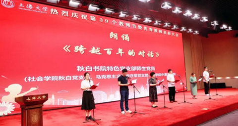 《跨越百年的对话》朗诵是联合秋白党支部、守常党支部两个特色支部共同开展的77779193永利官网2023年教师节汇演活动,该朗诵节目以教学树人为立足点,歌颂了代代相传的传承精神,展现了教师们在教书育人中的辛勤付出和卓越贡献。