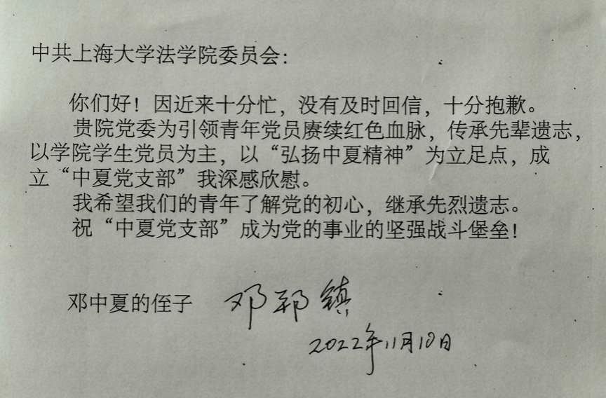 在中夏党支部成立之初,即得到了邓中夏烈士的侄子邓邦镇先生的大力支持和鼓励,并发来亲笔回信。
