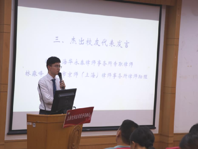 随后,海华永泰律师事务所专职律师沈航律师作为杰出校友代表和同学们进行了分享。沈航律师基于亲身经验,建议同学们多关注并全力以赴地参与到各类法律比赛中,作为律师,不仅需要良好的体力,细心与责任心也不可缺少。最后,沈航律师表达了希望老师们身体健康,同学们前程似锦的美好祝福。