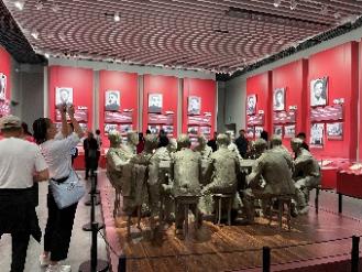 第三部分的主要内容是中国共产党早期组织的成立以及开展工人运动和宣传马克思主义思想。党员们在“南陈北李,相约建党”雕像和《星火》油画前驻足瞻仰,对中国共产党早期领导人的精神气象与人格风范表达最崇高的敬意。