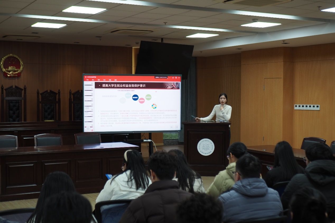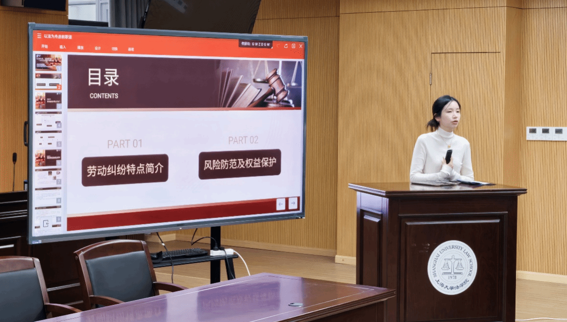 首先,主讲人徐炜同学入分析了我国劳动纠纷案件呈现出的显著特点。当前劳动纠纷案件数量庞大,反映出就业市场中各类问题频发;纠纷内容复杂多样,涉及薪资待遇、工作环境、合同履行等诸多方面;争议解决方式具有多样性,包括协商、调解、仲裁和诉讼等。同时,徐炜向同学们介绍了与求职就业联系密切的相关法律,强调这些法律是维护自身权益的有力武器。