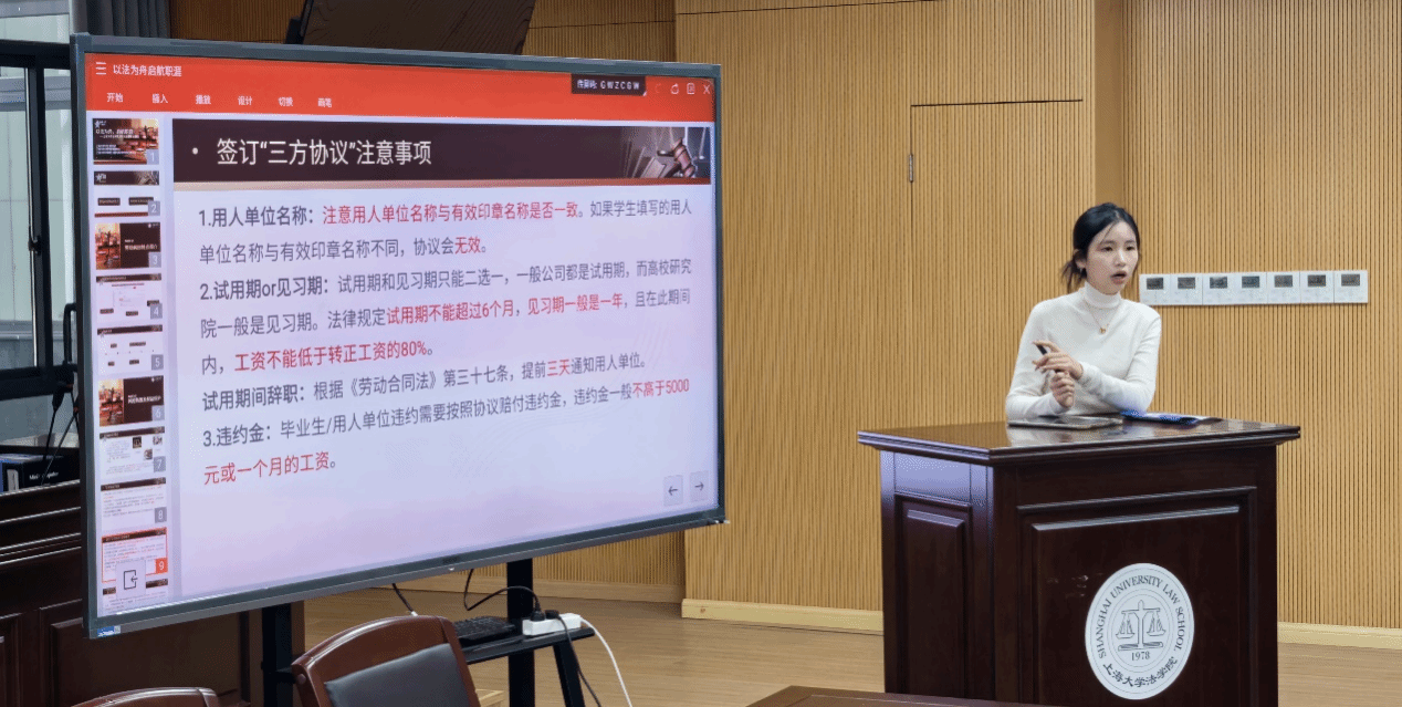 徐炜详细阐述了三方协议的概念、作用及签订注意事项。三方协议由毕业生、用人单位和学校三方签署,对户籍、档案等就业相关问题具有重要影响。签订时需注意用人单位名称与印章一致,试用期和见习期的选择及相关规定,以及违约金的赔付标准等,确保协议的有效性和自身权益不受侵害。