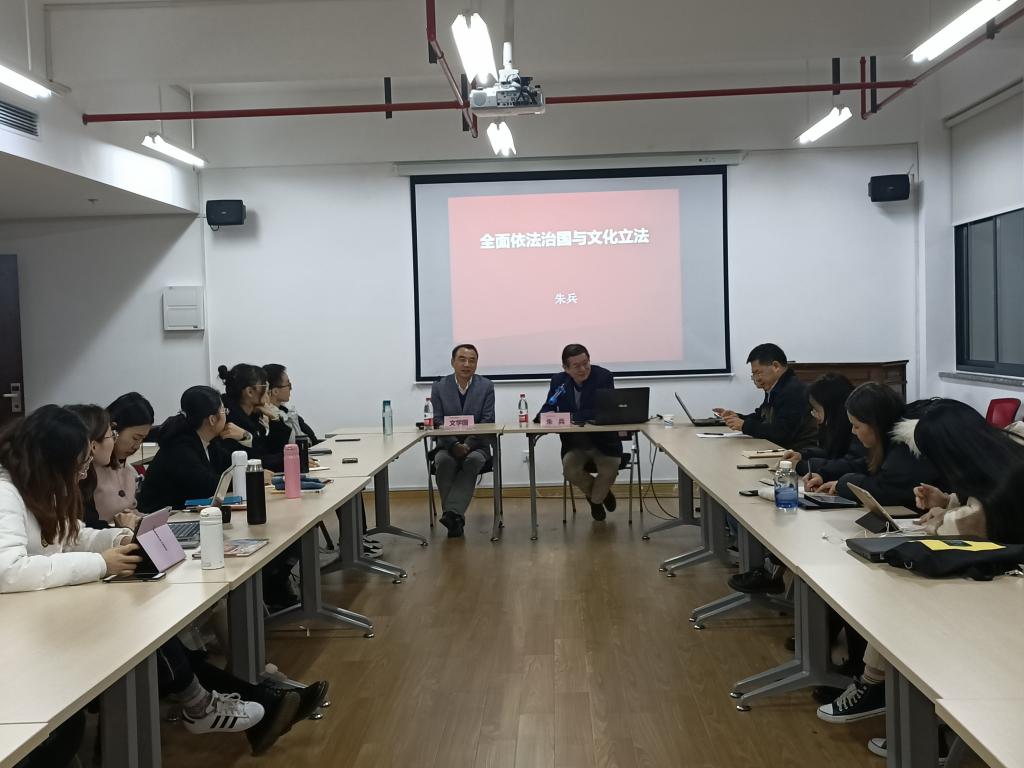 接着,朱兵老师简单介绍了文化立法概念、现状和特点。文化立法是指规范和调整文化领域内文化成果的创造、生产、传播、消费、保护、弘扬以及文化促进、服务和管理等的各种社会关系立法。文化立法是为中国特色社会主义文化繁荣发展建立最权威、最稳定的法律制度和规范,文化法律是中国特色社会主义法律体系中不可或缺的重要组成部分。文化立法具有保障作用、规范作用、保护作用、促进作用和强制作用。党的十八大以来,我国文化法治进入新时代。