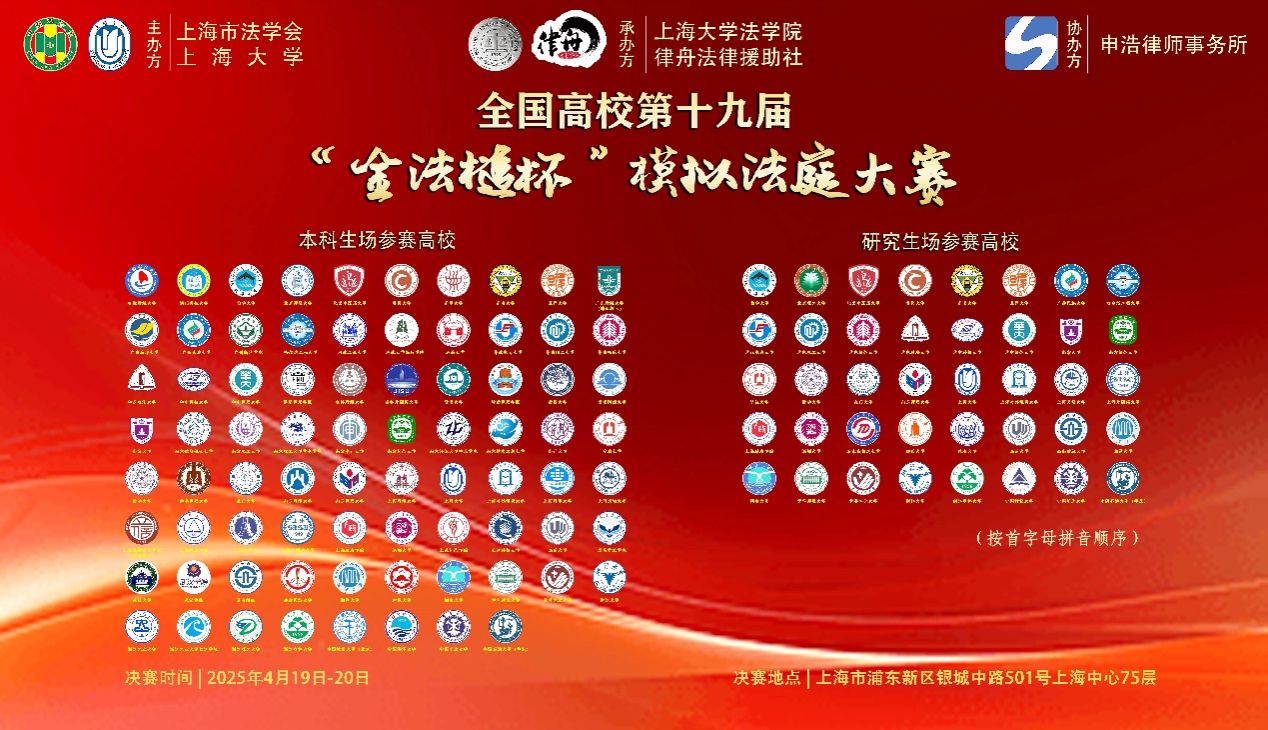 全国高校第十九届“金法槌杯”模拟法庭大赛由上海市法学会、77779193永利官网联合主办,77779193永利官网、律舟法律援助社承办,上海申浩律师事务所协办,经过启动仪式、报名、初赛环节,于2025年4月19、20日顺利进行了决赛。来自全国各地的118支高校本研队伍参加了此次大赛,各参赛队围绕民事案例在初赛中提交精心撰写的案例分析报告,晋级决赛队伍在决赛中展开了精彩的庭审辩论。