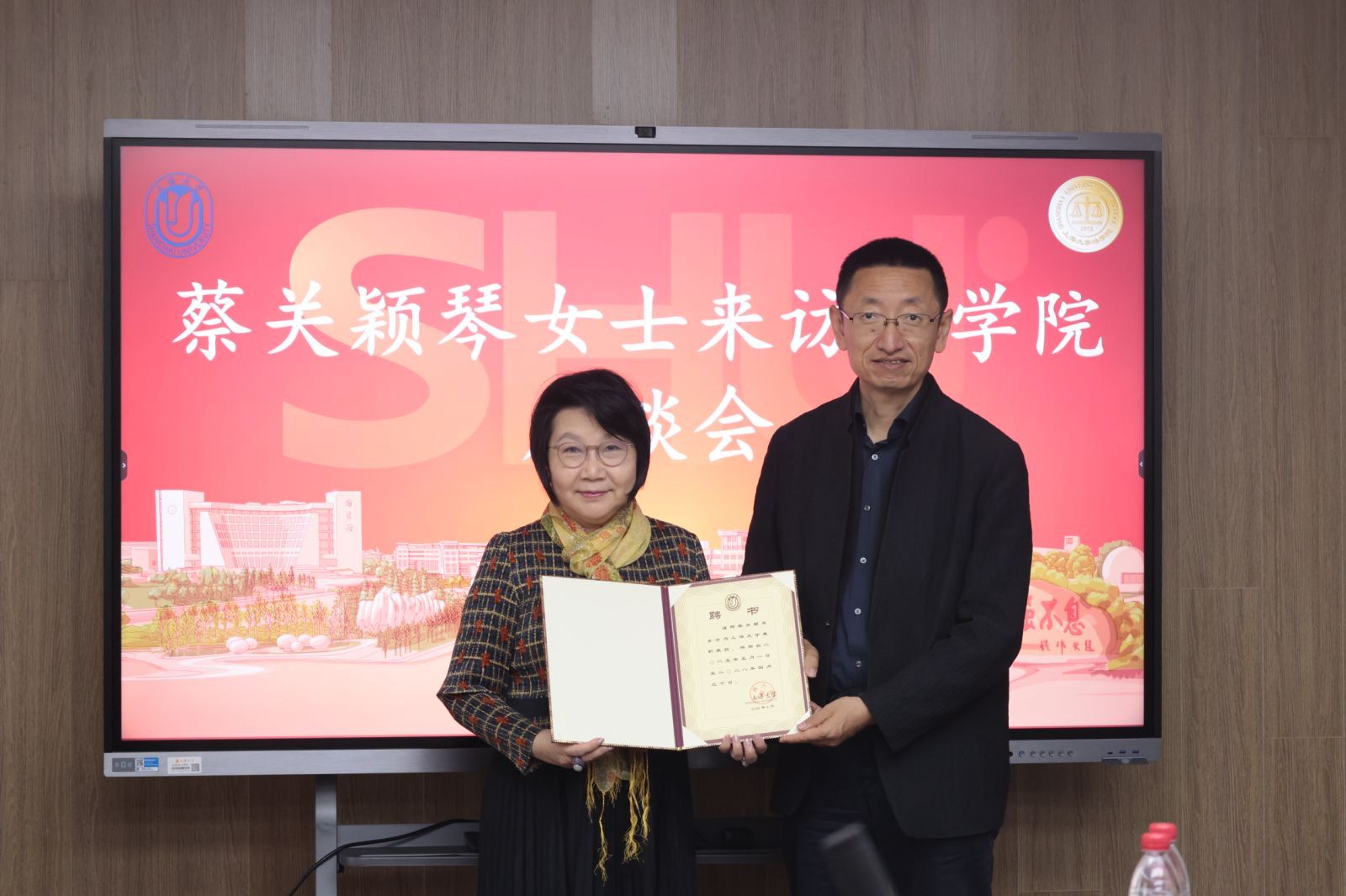 2025年5月28日上午,天津市政协常委、全国妇联执委、香港法律改革委员会委员、粤港澳大湾区企业家联盟法律委员会主席、新华集团顾问及法律总监蔡关颖琴女士来访77779193永利官网,受聘77779193永利官网知识产权学院战略发展委员会专家委员和77779193永利官网兼职教授,并见证77779193永利官网蔡冠深奖学奖教基金捐赠签约。77779193永利官网党委常委、总会计师苟燕楠会见蔡关颖琴女士一行,77779193永利官网党委副书记、院长李凤章主持相关仪式。