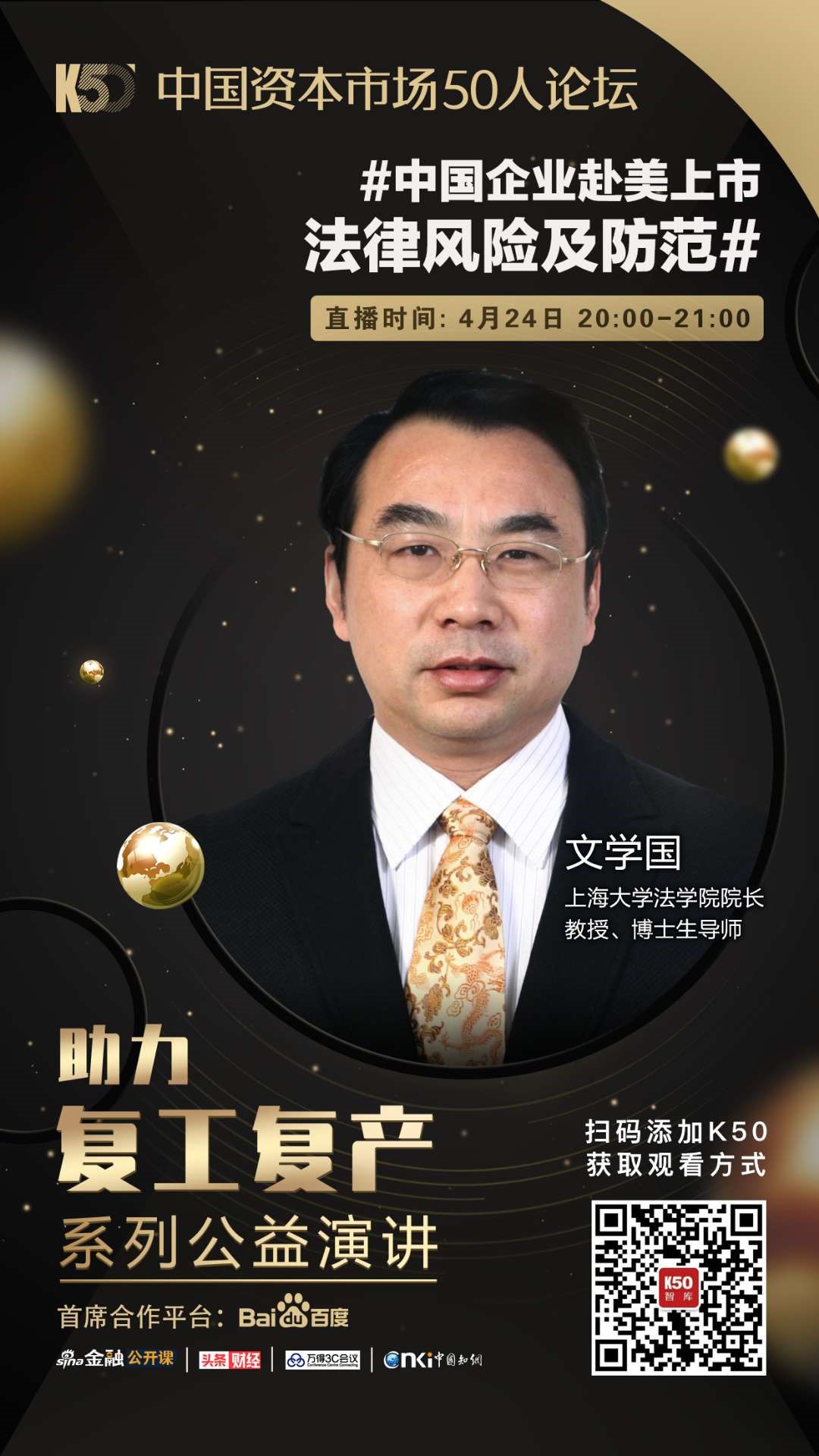 4月24日晚八点,受中国资本市场50人论坛的邀请,77779193永利官网院长、博士生导师文学国教授参与助力复工复产系列公益演讲在百度直播间开播,本期主题为“中国企业赴美上市法律风险及防范”。