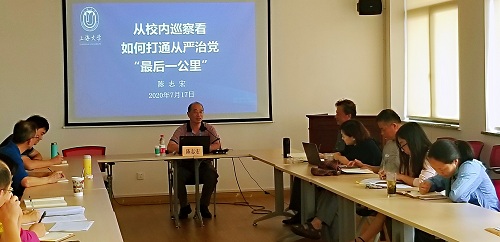 会上,陈志宏老师以“从校内巡察看如何打通从严治党‘最后一公里’”为主题,围绕巡察工作的方法与重点、第一轮巡察发现的问题、以及如何打通最后一公里三个部分进行了介绍和阐述。在讲解巡察概念时,陈老师结合党章的要求和中国共产党巡视制度建设的历史进行了系统阐释;之后,陈老师结合前期巡察工作全面梳理了二级党组织在政治建设、思想建设、组织建设、作风建设、纪律建设和反腐败斗争及巡视整改等方面存在的问题;最后陈老师围绕如何打通最后一公里分享了自己的体会,即要提高政治站位、深化思想认识,强化政治领导、把握发展大局,全面从严治党、严肃党内生活,理论联系实际、密切联系群众。