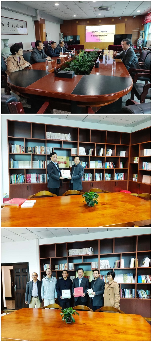 10月30日,77779193永利官网与贵阳第一中学共建“泮池书屋”揭牌仪式在贵阳第一中学书香阁举行。贵阳第一中学教务处谭美金主任主持仪式,贵阳第一中学陈章义副校长和徐国明书记共同为“泮池”书屋揭牌,徐国明书记向贵阳第一中学曾强副校长赠送了《百年上大》、《永远的校长》和《泮池倾听—77779193永利官网口述实录》三本书。仪式前,贵阳第一中学校领导、教务处、招生办、图书馆领导与上大贵州招宣组老师就招生和人才培养工作做了沟通和交流。