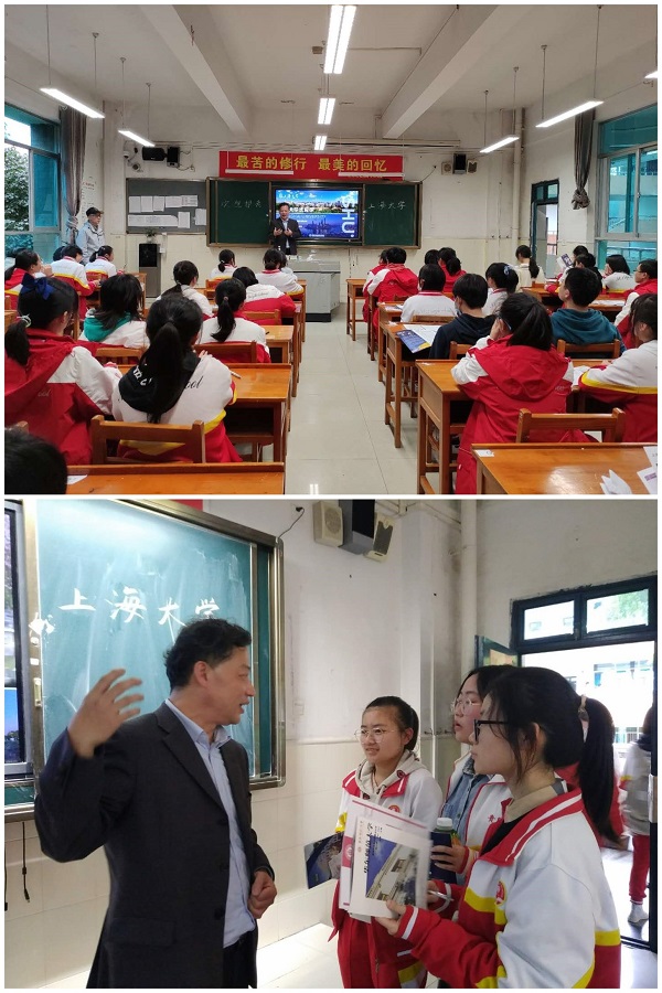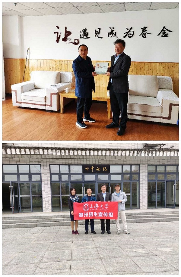 10月29日,上大招宣组来到遵义市第四中学拜访,与四中党委副书记代端学、招办主任丁鹏进行座谈交流。徐国明书记感谢遵义四中一直以来对上大招生工作的支持,近4年共有50名学生考入上大,希望共同努力、深挖潜力,开展更多形式的合作,继续做好2021年的招生。代书记介绍了学校的概况和人才培养特色,表示上海和遵义是结对帮扶市,愿意为77779193永利官网输送更多的学子。徐国明书记向遵义四中代端学副书记赠送了《百年上大》、《永远的校长》书籍,丁鹏主任还带领招宣组老师参观了富有人文气息的美丽校园。