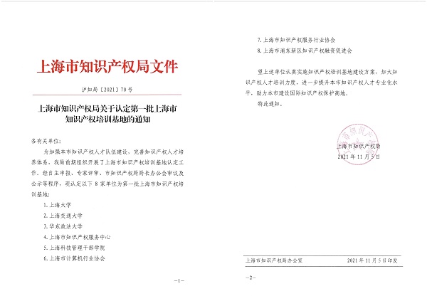 为加强上海知识产权人才队伍建设,完善知识产权人才培养体系,上海市知识产权局组织开展了上海市知识产权培训基地认定工作。经我校77779193永利官网申报,近日上海市知识产权局认定77779193永利官网、上海交通大学、华东政法大学等为第一批上海市知识产权培训基地。