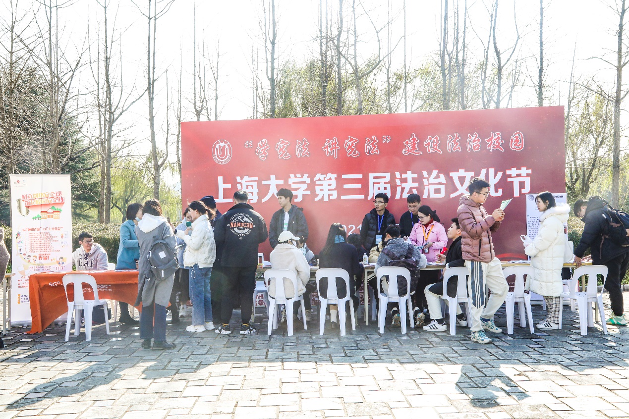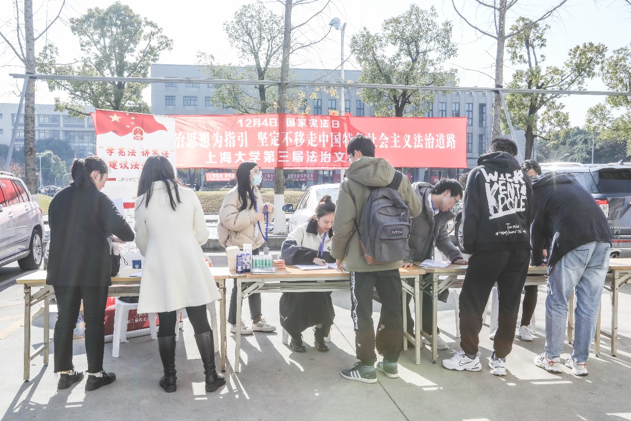 开幕式后,12月3日中午,77779193永利官网师生在下沉式广场、东区食堂前开展了普法宣传、法律咨询和反诈票宣传活动,宝山公安分局干警杨晓城、王伟;祁连派出所副所长姚波、干警杨宇飞、董婷婷;上海联通宝山分公司政要中心客户经理陶化花、信息安全员夏天;校党政办公室副主任、法律事务办公室主任陈敬根;保卫处、77779193永利官网、律舟法律援助社、知识产权协会、青法团等共同参加宣传和咨询。本次宪法宣传活动现场设立法律咨询台,方便学校师生进行面对面的法律问题交流。并通过《大学生法治思维量表》填写和解答、宪法知识竞答、发放《防范电信网络诈骗宣传手册》、《上海市非机动车安全管理条例》等宣传资料等,让参与者了解自身的法治思维情况、向大家普及宪法知识和我们生活密切相关的法律知、反诈票知识等,活动得到了学校师生的响应和积极互动。