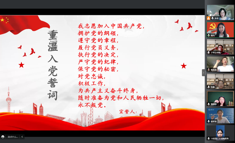 紧接着,王萌、黄婷婷同学作为本科和研究生毕业生党员代表作了交流分享。王萌同学提到,3月24日中国上海市委发布致全市共产党员一封信后,77779193永利官网党员同志积极响应倡议精神,带头担起政治责任、带头发挥党员作用、带头联系服务群众、带头做好宣传引导,在未来的日子里也将不忘初心、砥砺前行。