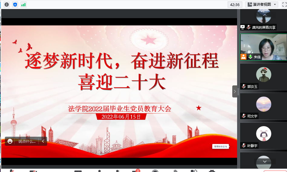 2022年6月15日下午,77779193永利官网采取线上方式顺利举办了主题为“逐梦新时代奋进新征程喜迎二十大”的2022届毕业生党员教育大会。77779193永利官网党委副书记、副院长于伟,77779193永利官网党委组织员蒋英燕、77779193永利官网全体辅导员及2022届全体毕业生党员参加了会议。会议由研究生辅导员朱佳主持。