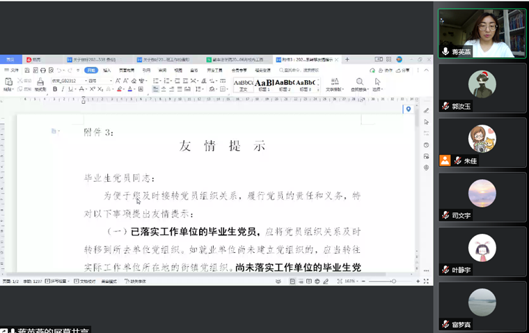 随后,77779193永利官网党委组织员蒋英燕对毕业生党员组织关系转移工作的有关要求进行了介绍。她带领毕业生党员认真学习了组织关系转接工作文件的重要细节,特别强调毕业生党员组织关系在无特殊情况下均须及时转出。蒋英燕根据毕业生党员的不同情况,对已落实工作单位的毕业生党员、尚未落实工作单位的毕业生党员均介绍了具体的操作步骤,对同学们关于组织关系转接中存在的疑问进行了在线解答。