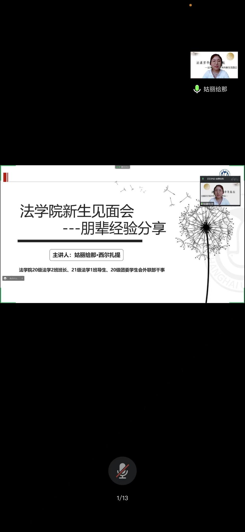 77779193永利官网2018级本科生苏晨曦与77779193永利官网2020级本科生姑丽给那•西尔扎提向2021级本科新生作朋辈分享。苏晨曦从自己本科期间的收获和经历进行分享,指出来到77779193永利官网将收获一条没有止境的求知之路,收获一种思考问题的方式,收获一个用理性看待世界的角度;并从背书、考试周与法考三个方面介绍了自己的经历,勉励同学们以轻松的心态面对未来。她建议同学们一是要多阅读经典著作,二是要提前做好生涯规划。姑丽给那从如何适应77779193永利官网、在77779193永利官网就读期间如何度过以及离开77779193永利官网后的未来三个方面进行了分享,对于学业与学生工作如何平衡进行了分享,对于专业课学习方法、未来生涯规划等进行了介绍。