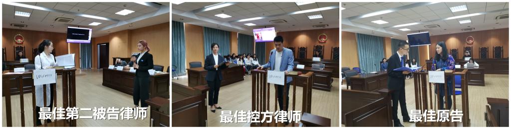 朱宜婕同学、姜胤同学以及李丽钦同学在庭审现场表演投入,得到评委与观众的认可,分别获得了最佳原告、最佳第一被告和最佳第二被告的荣誉。