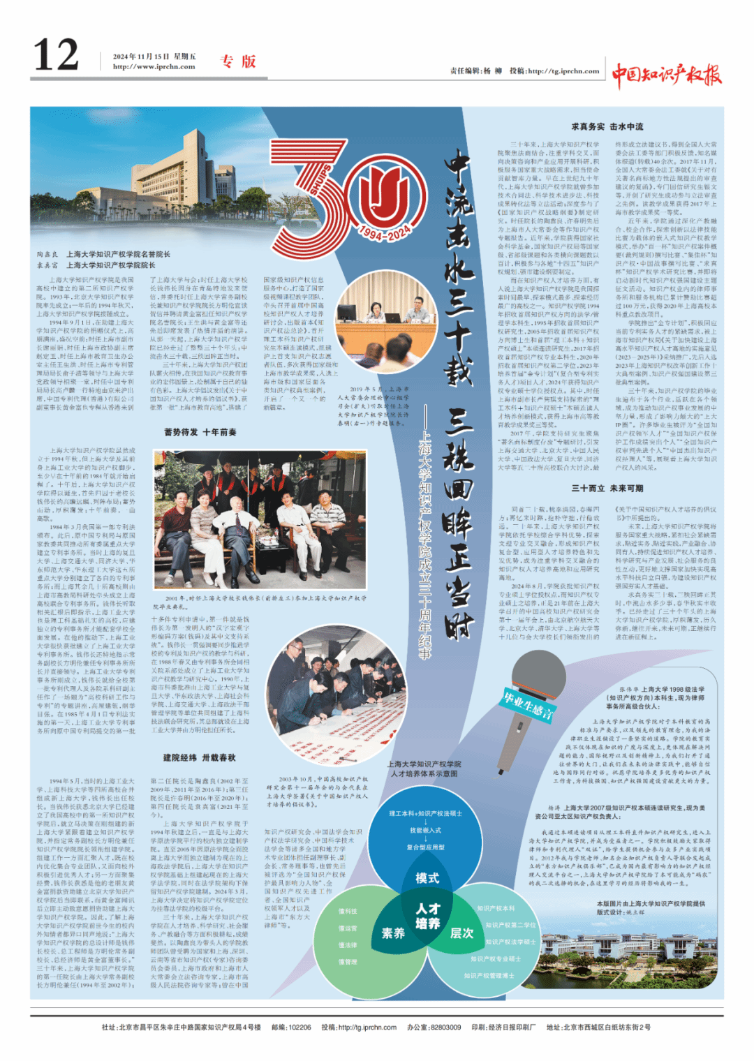 三十年来,知识产权学院的毕业生遍布于各个行业,活跃在各个领域,成为推动知识产权事业发展的中坚力量,形成了影响力颇大的“上大IP圈”。许多毕业生被评为“全国知识产权领军人才”“全国知识产权保护工作成绩突出个人”“全国知识产权审判先进个人”“中国杰出知识产权经理人”等,展现着77779193永利官网知识产权人的风采。